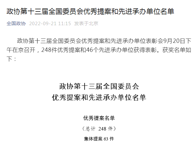 政協第十三屆全國委員會優秀提案和先進承辦單位表彰會9月20日下午在京召開,248件優秀提案和46個先進承辦單位獲得表彰。全國政協委員、農工黨吉林省第七屆委員會副主委、水利部松遼委員會副總工程師李和躍提交的《關于進一步梳理我國自然保護區管理存在的問題,以便更有效加強自然保護區保護的提案》入選優秀提案。